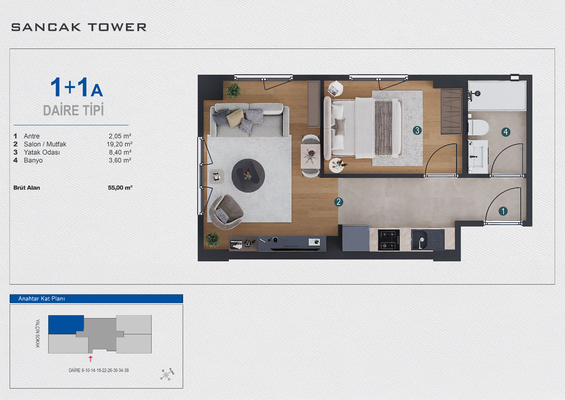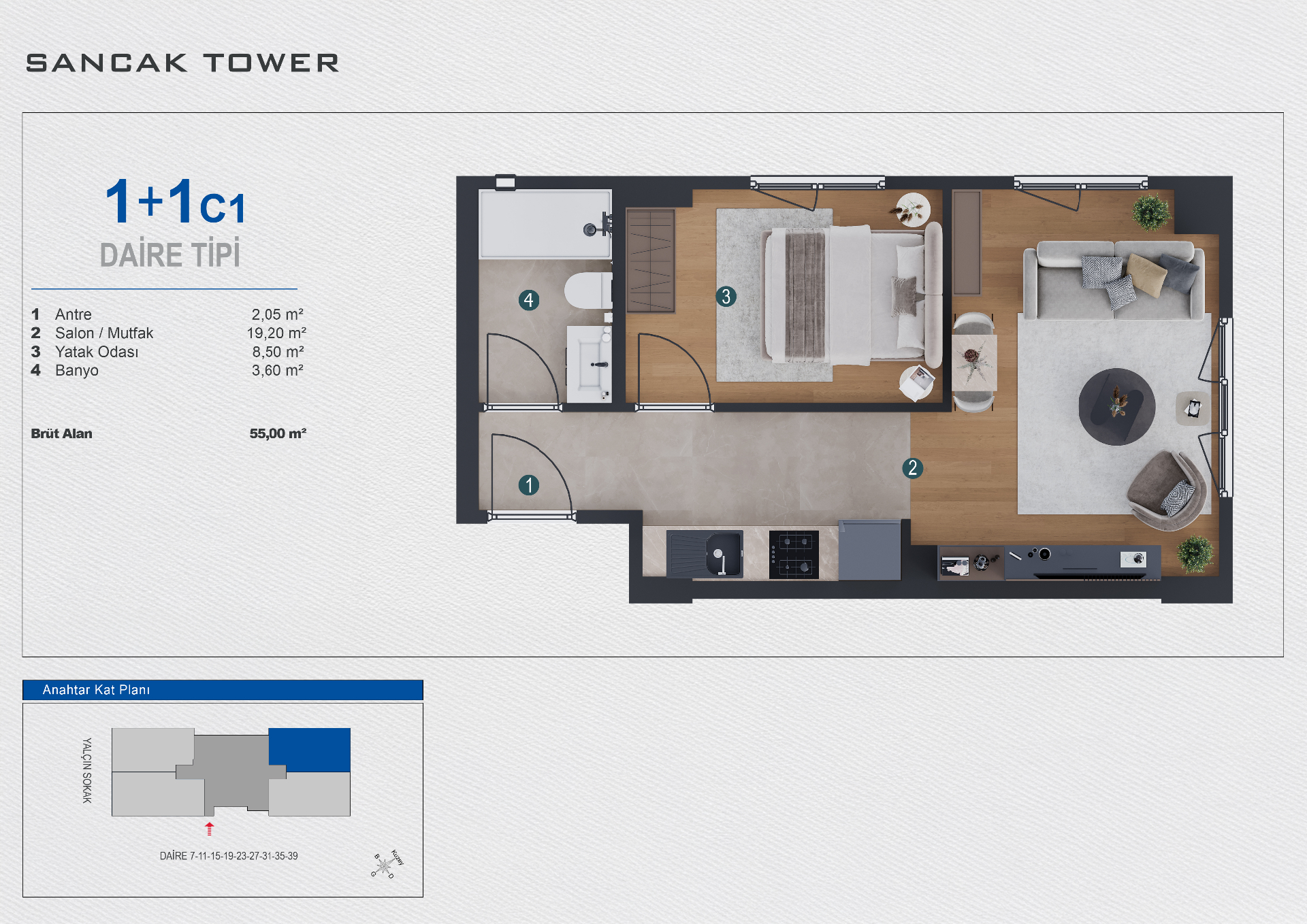 Projemiz kapsamında, 40 adet 1+1 daire inşa edilecek olup, yüksek kalite standartlarında, estetik tasarıma sahip konutlar sizleri bekliyor. Ulaşım kolaylığı sağlayan merkezi konumuyla, hem yatırım hem de yaşam için ideal bir fırsat sunan projemiz, şehrin tüm imkanlarına yakınlığıyla da öne çıkıyor.