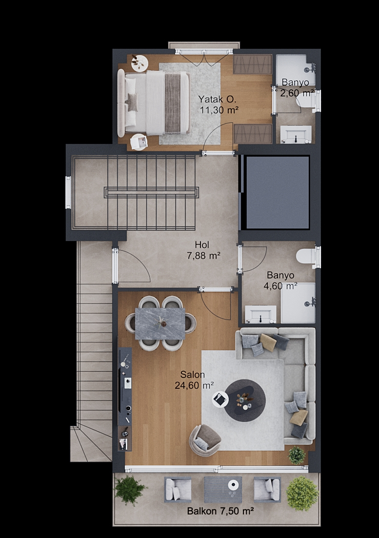 Toplam 250 m² kullanım alanına sahip, 4 katlı ve 4+1 olarak tasarlanan villalarda; her odada ebeveyn banyosu ve villa içi özel asansör bulunmaktadır. Geniş ve ferah yaşam alanları, konforu ön planda tutan detaylarla tamamlanmıştır.
