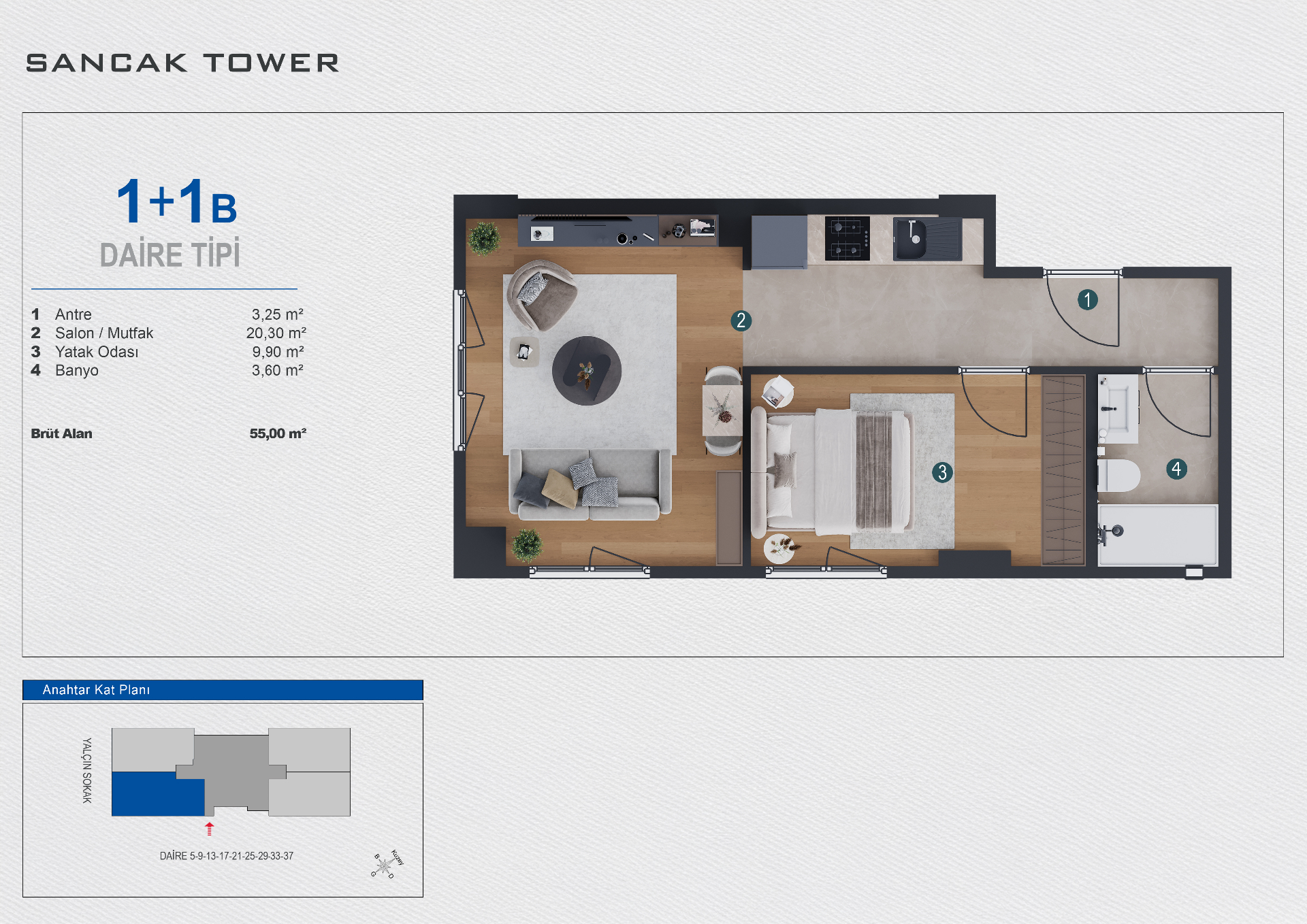 Projemiz kapsamında, 40 adet 1+1 daire inşa edilecek olup, yüksek kalite standartlarında, estetik tasarıma sahip konutlar sizleri bekliyor. Ulaşım kolaylığı sağlayan merkezi konumuyla, hem yatırım hem de yaşam için ideal bir fırsat sunan projemiz, şehrin tüm imkanlarına yakınlığıyla da öne çıkıyor.